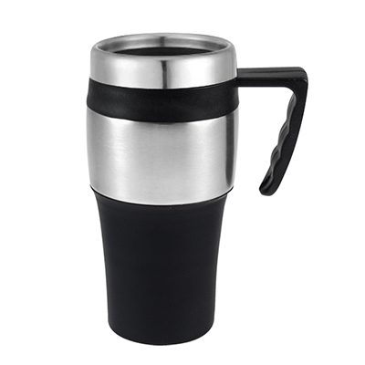 Mug térmico de doble pared aislante con tapa rosca de acero inoxidable y dosificador. Interior de PVC negro y exterior de PVC negro y acero inoxidable.