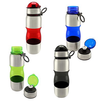 Botella deportiva modelo “Trend”, de Acero Inoxidable con plástico rígido traslúcido. Para líquidos fríos (no térmico).
