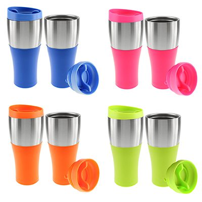 Coffee Mug grande de 470ml. de plástico “PP-FRESH”, con tapa rosca en el mismo material y banda de Acero Inoxidable ideal para imprimir logos. Presentación en caja de cartón plateado.