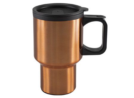 Mug metálico encobrizado, tapa con dosificador. Interior, tapa y asa de PVC negro. Presentación en estuche de cartón laminado negro.