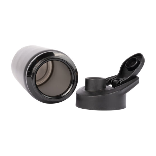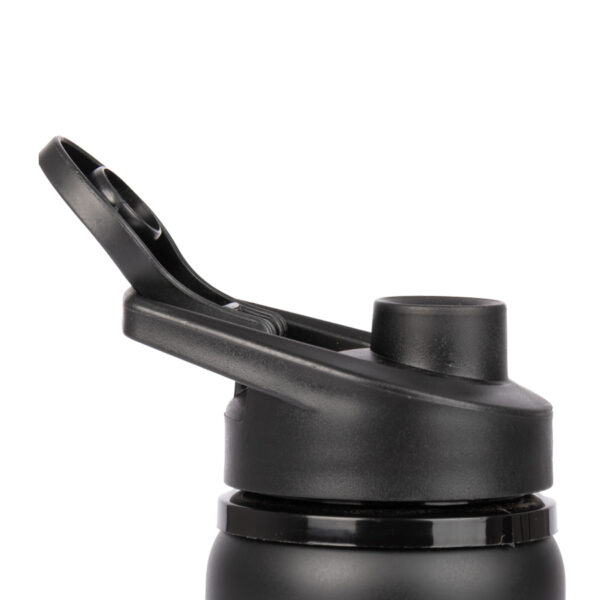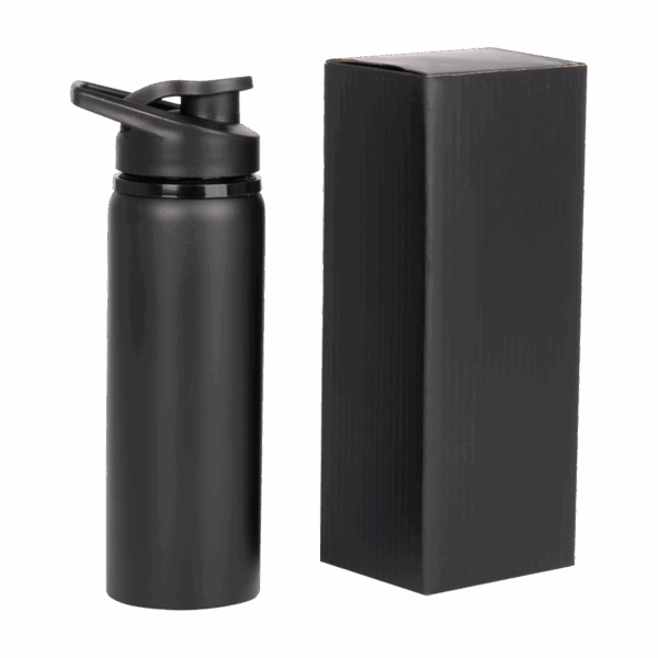 Sport Bottle botella metálica de Acero Inoxidable 304 SS modelo «APIA», con tapa rosca de plástico PP negro, asa de sujeción y anillo de silicona, anti-derrame. Producto BPA FREE, para el contacto con líquidos y alimentos. Capacidad 750ml. Presentación en bolsa PP + caja de regalo de cartón lacado color negro.