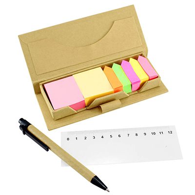 Memo Set Ecológico con Bolígrafo Ecológico escritura negra, 1 Regla 12 cm., 300 Post-it y 750 banderitas adhesivas de colores.