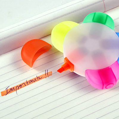Multidestacador modelo “Flower” con 5 destacadores de colores. Amplio espacio central para logo.