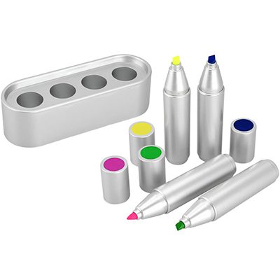 Set de 4 destacadores de color, sobre base plástica plateada. Presentación en caja de cartón color plata.