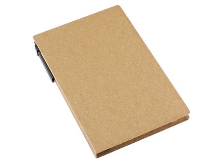Memo set Ecológico Grande de Cartón natural. Incluye Bolígrafo Ecológico, 50 post-it amarillo claro grandes de 14.4 x 7.5 cm., 25 post-it amarillos medianos de 7.7 x 7.7 cm y 125 banderitas adhesivas de colores de 4.5 x 1.3 cm.