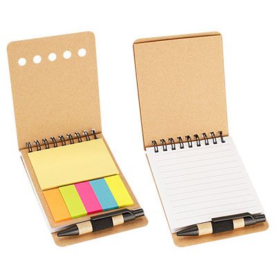 Incluye 1 Bolígrafo Ecológico corto + 125 banderitas adhesivas de colores + 25 post-it rectangulares + Block de Notas con 60 hojas blancas lineadas.