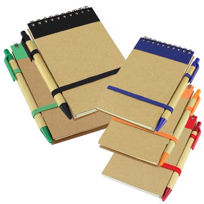 De cartón reciclado, 70 hojas interiores blancas (croqueras). Incluye cierre elasticado de color y bolígrafo ecológico al tono.