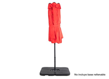 Quitasol ovalado doble de 4.55 x 2.7 m, modelo “Twins”, con 12 cascos de lona Poliéster UV impermeable de 180g. Contiene varas reforzadas de Acero recubierto de 12 x 18mm, asta de Acero recubierto de 48mm, sistema de apertura automático con manivela.