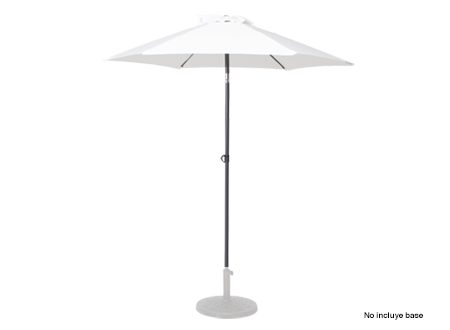 Quitasol redondo de Ø2m, modelo “Twist”, con 6 cascos de lona Poliéster UV impermeable de 160g. Contiene varas reforzadas de Acero recubierto de 12 x 18mm, asta de Acero recubierto de 32mm, sistema de apertura manual y codo giratorio de 45°. No incluye base.