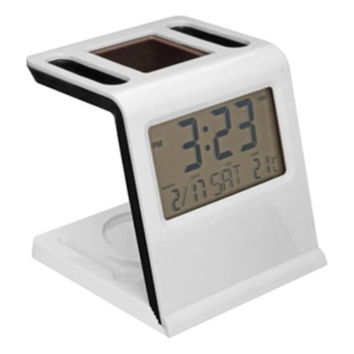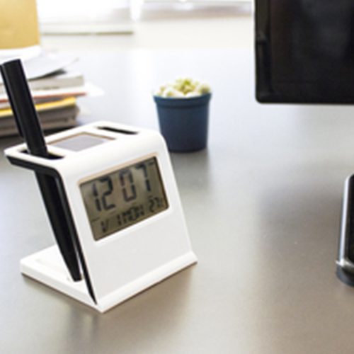 8 x 8 cm. Plástico. Reloj solar y porta lápices. Reloj, alarma, temporizador, fecha, día y temperatura. Sin la luz solar cambia automaticamente y funciona con una batería botón. Dos compartimentos para lápices pasta y espacio imantado para guardar clips. Se convierte en tarjetero cuando se desmonta el reloj.