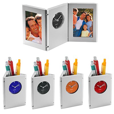 Porta-Lápices plegable con reloj análogo y 2 porta-fotos laterales, cuerpo gris plata.