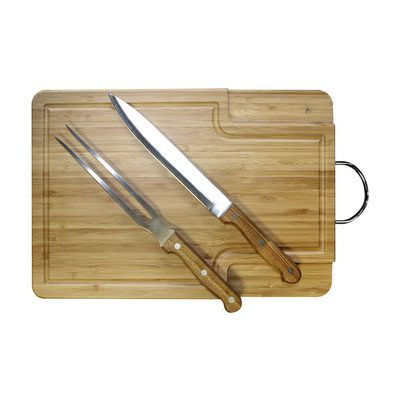 38 x 25 x 2,5 cm. Madera. Set de parrilla con tabla, cuchilla, tenedor asador y manilla.