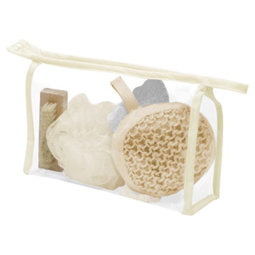 18,5 x 12 x 5 cm. Plástico. Set con 2 esponjas una es exfoliante, piedra/lima y cepillo para uñas.