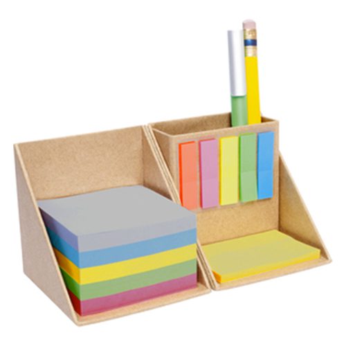 18 x 8,7 cm (abierto). 8,7 cm. (cerrado). Cartón Color Madera. Set de block de colores, señaladores de diferentes colores, post-it y porta lapicero.