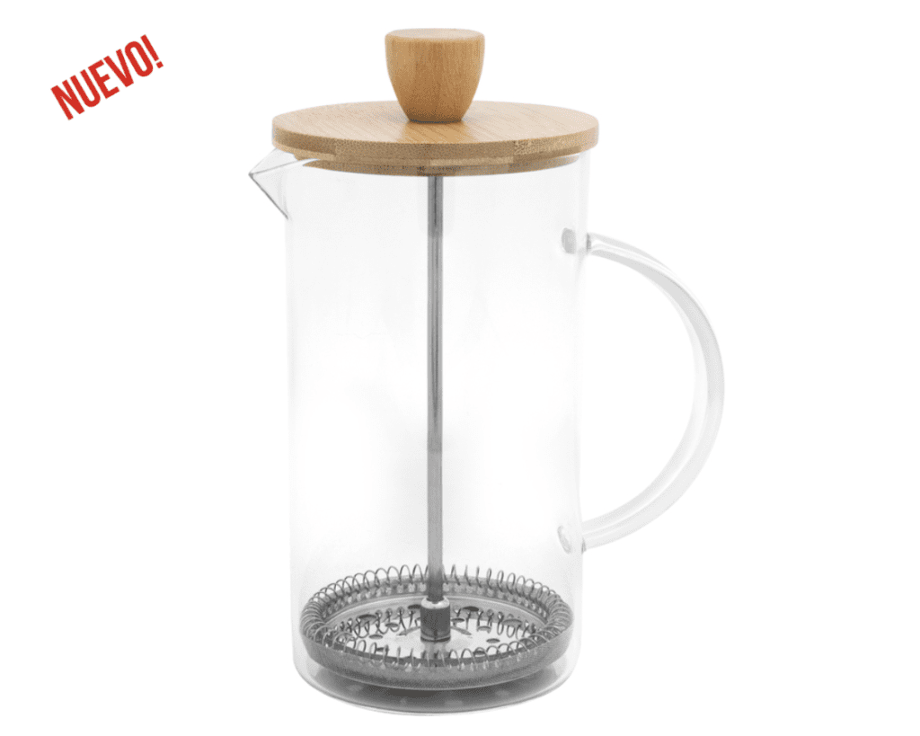 Ø 8 x 18 cm. Capacidad 600ml. Vidrio de Borosilicato + Tapa de bambú. Cafetera Prensa Francesa con filtro de aluminio. Presentación en caja de regalo Kraft.