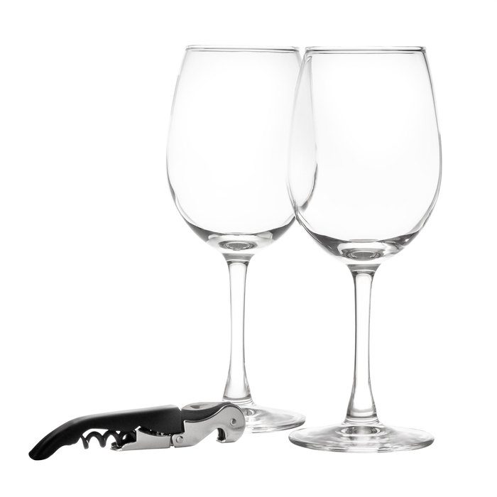 Ø 7,4 x 20 cm. Capacidad 350 ml. cada copa. Vidrio + Acero inoxidable. Set de 2 copas para vino y sacacorchos. Abridor de botellas en acero inoxidable 430 + acero cromado con acabado negro mate. Incluye espuma protectora donde encajan las piezas para su guardado y traslado. Presentación en caja de regalo kraft.