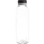 Botella de plástico de color negro translúcido con tapa a rosca color negro mate con anillo de silicona de diferentes colores.