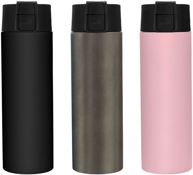 Ø 7 cm x 23 cm. Acero inoxidable. Capacidad 450 ml. Botella doble pared, sellada al vacío. Interior de acero 304 y exterior de acero 201. Pintura acabado mate. Tapa en PP con traba de seguridad y botón pulsador de apertura. Mantiene por más de 12 hs la temperatura de las bebidas calientes y 24 hs de las bebidas frías. Presentación en caja de regalo kraft.