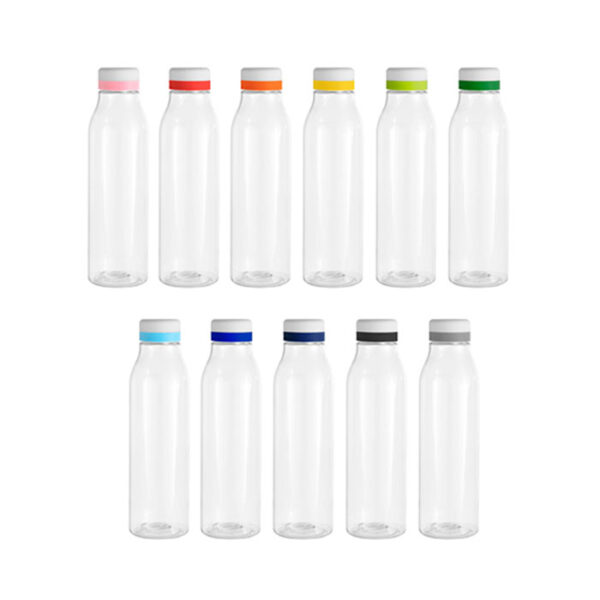 Botella de plástico transparente con tapa a rosca color blanco mate con anillo de silicona de diferentes colores.