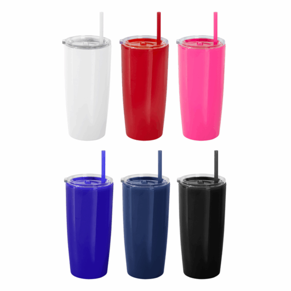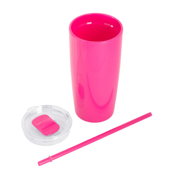 Mug doble pared con sorbete. Tapa plástica transparente a presión con anillo de silicona. Sorbete de polipropileno y cierre deslizante del mismo color que el cuerpo. Cuerpo con acabado brillante.