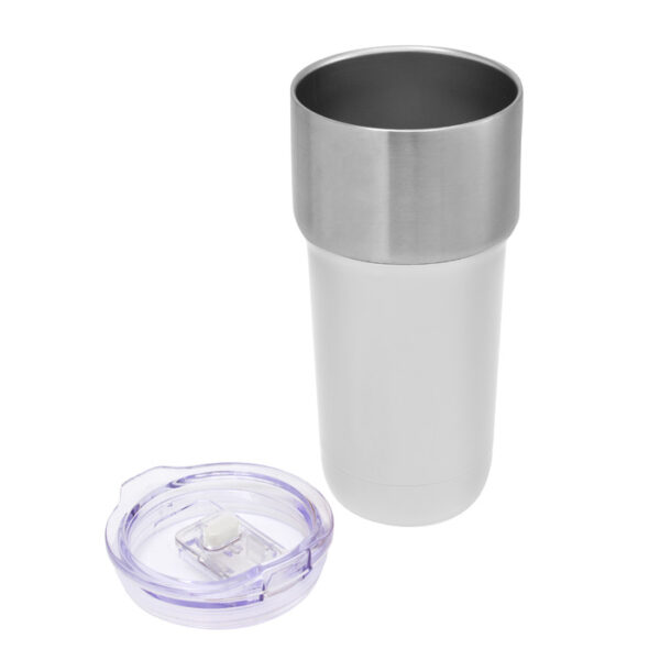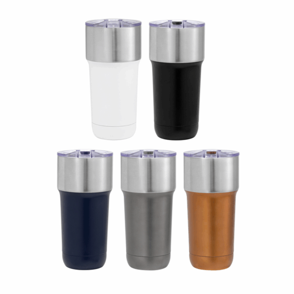 Mug doble pared, sellado al vacío. Mug con aislamiento térmico. Tecnología vacuum. Interior en acero 304 y exterior en acero 201. Tapa de poliestireno con anillo de silicona y detalles en color en juego con el cuerpo. Pintura powder coat (pintura más duradera y resistente a la corrosión y el paso del tiempo), parte superior en acero inoxidable. Mantiene hasta 12 hs la temperatura de las bebidas calientes y 24 hs de las bebidas frías.