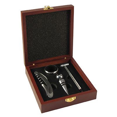 Set de 4 accesorios metálicos de vino en caja de madera barnizada.