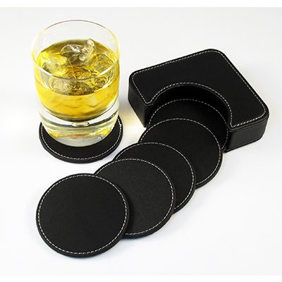 Set de 6 posavasos redondos, en PU negro. Incluye contenedor cuadrado.