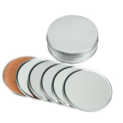 Set de 6 posavasos redondos de Aluminio con reverso antideslizante de corcho. En estuche redondo de aluminio.