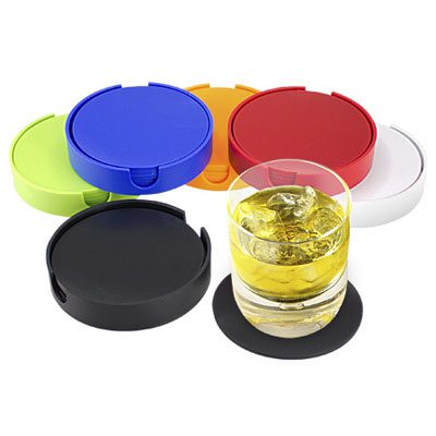 Set de 6 Posavasos Plásticos Redondos de 9.9 cm de diámetro, en plástico ABS de 3 mm de espesor. Contenidos en dispensador redondo del mismo material y color. Presentación en caja de cartulina blanca.