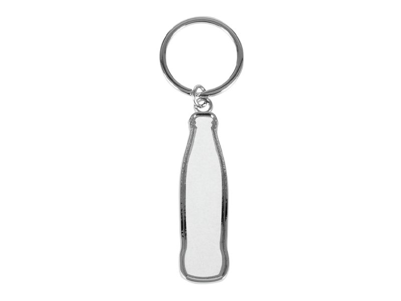 Llavero-destapador metálico con forma de botella de bebida gaseosa, para Sublimación. Incluye argolla llavero de Acero inoxidable. Presentación en estuche negro con cama aterciopelada negra.