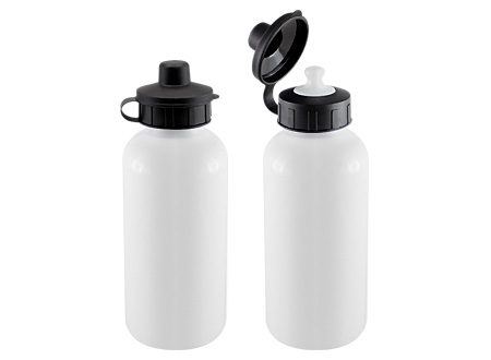 Sport Bottle (Botella deportiva) de 500cc. con cuerpo blanco para Sublimación. Contiene 2 tapas negras para diferentes usos. Presentación en caja de Cartón Blanco.