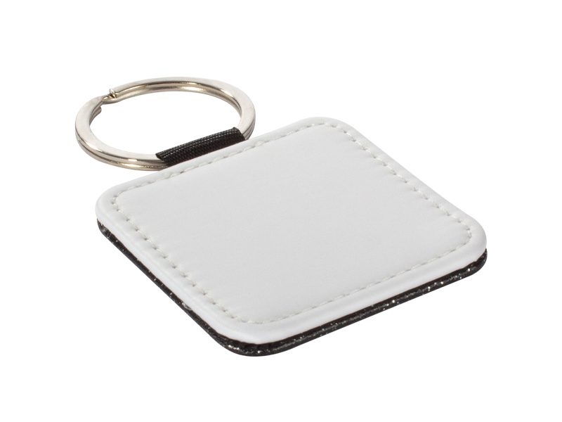 Llavero cuadrado de PU blanco para sublimación. Reverso capa PU negro con brillo (no sublimable). Argolla de Acero inoxidable.
